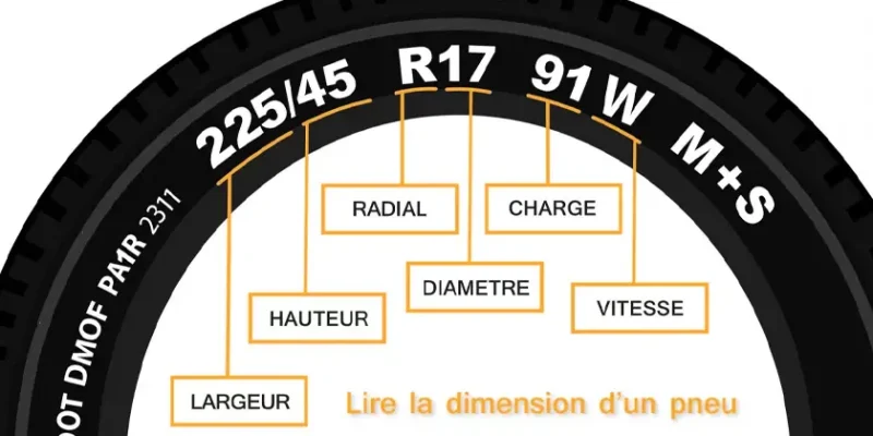 Prenons le code 225/45 R17 91W. La lecture se fait dans l’ordre suivant depuis la gauche vers la droite :
